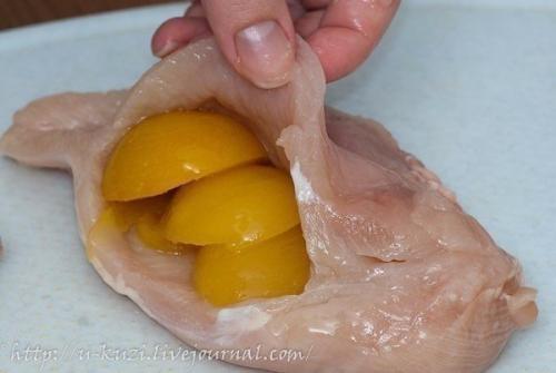 1. вырезать ножом сбоку куриного Филе карманчик и наполнить абрикосами. Снаружи натереть солью.