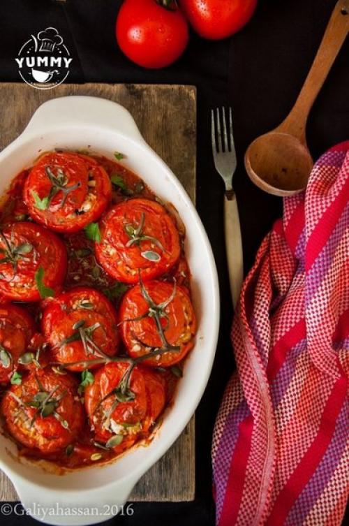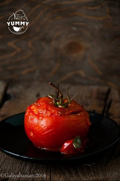 3. начинить помидоры фаршем, обмазать оливковым маслом со всех сторон, уложить их в форму и залить полстакана воды в форму и запекать при 180 гр с 35 минут. Подавать к столу. Приятного аппетита!