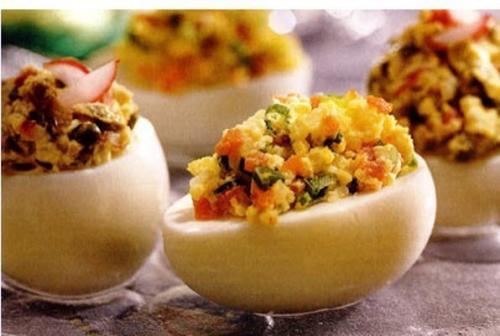 20. желток, обжаренный лук, лосось в масле или печень трески. 21. Желток, сваренные и обжаренные шампиньоны (белые грибы), ветчина, жареный лук и майонез.