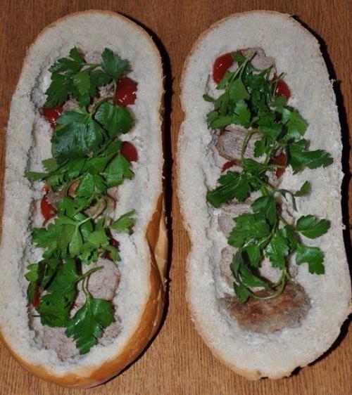 Батон нужно разрезать вдоль пополам, вынуть мякиш (его можно заморозить и использовать потом на котлеты или др. ), Смазать соусом и заполнить начинкой.