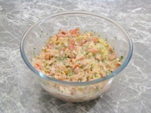 Шаг 9 немного посолить, поперчить, добавить майонез, хорошо перемешать.