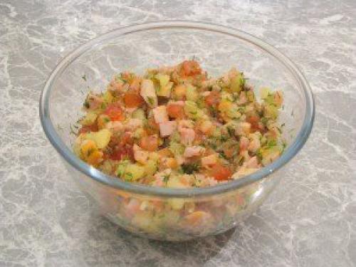 Шаг 8 смешать мякоть картофеля, мясо, помидоры, зелень.
