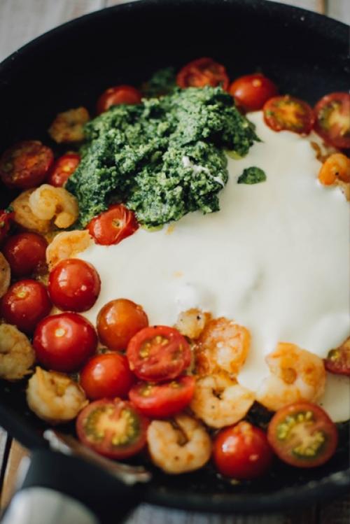 3. добавьте сметану и песто. Аккуратно перемешайте и готовьте пять минут. Добавьте пасту и снова аккуратно перемешайте. Посолите, поперчите по вкусу. Подавайте с тертым сыром пармезан. Сохрани рецепт, чтобы не потерять!