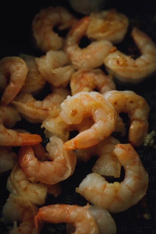 2. пока паста варится, растопите масло в большой сковороде на среднем огне. Добавьте чеснок и обжарьте до аромата около 1 минуты. Добавьте креветки и обжарьте их с двух сторон 2-3 минуты до розового цвета. Добавьте помидоры Черри, посолите и поперчите. Готовьте еще 2 минуты, постоянно помешивая.