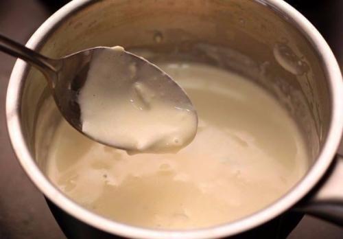 2. когда сыр начнет таять, влейте сливки и, помешивая, доведите до кипения. Затем выключите огонь. Совсем однородной консистенции не будет из-за плесени, но она и не нужна.