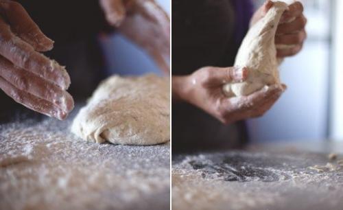 3. тесто разделите на 2 части и каждый шарик раскатайте на присыпанной мукой доске.