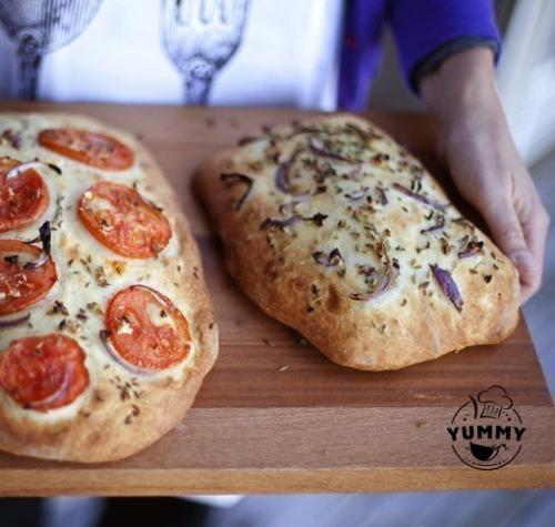4. выложите кольца лука, помидора, чеснок, тмин и тимьян. Сбрызните оливковым маслом, оставьте еще на 15 минут.