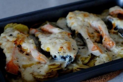 5 на рыбу выложить морковь с луком и залить чесночным соусом. Форель в чесночным соусом на картофеле будет готовиться в духовке 45 минут при температуре 180 градусов.