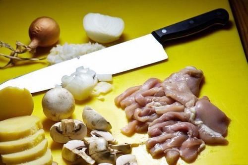 1. куриные бедра тщательно промыть, обсушить полотенцем и нарезать брусочками. Шампиньоны тщательно промыть, очистить и нарезать дольками. Репчатый лук очистить и нарезать кубиками (0, 5 х 0, 5 см. Отварной картофель очистить и нарезать кружочками толщиной 0, 5 см.