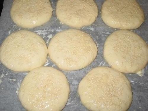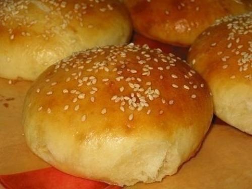 Когда тесто поднимется, переложить его на стол, смазанный растительным маслом, руки так же смазать маслом, муку больше не использовать, поделить тесто на 8-9 шариков. Противень застелить промасленной бумагой, переложить булочки, слегка примять их руками, придать красивую аккуратную форму, накрыть пленкой, дать расстоятся еще минут 10-15. Затем включить духовку на 200 градусов, булочки еще раз немного примять, смазать взбитым яйцом и посыпать кунжутом. Поставить булочки в теплую духовку, не ждя пока она сильно нагреется. Выпекать до золотистого цвета.