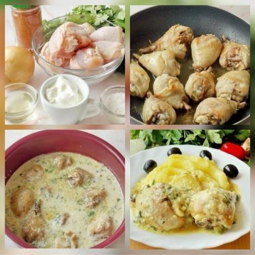 1. для приготовления этого блюда понадобятся: кусочки курицы, лук репчатый, сметана, чеснок, подсолнечное масло, соль, красный сладкий молотый перец, петрушка, укроп.