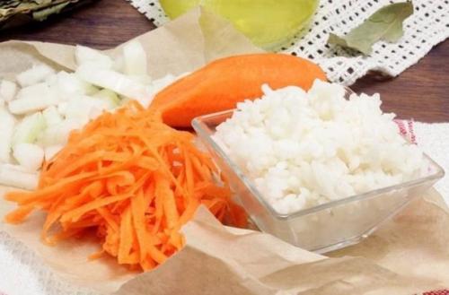 1. вымыть и очистить морковь, натереть ее на крупной терке. Лук очистить и нарезать мелким кубиком. Рис отварить. На сковороде обжарить лук с морковью, остудить.