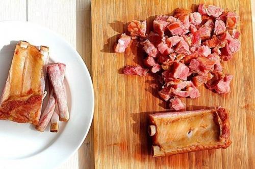 Ребрышки достать и остудить. Мясо от костей отделить. Кости выбросить.