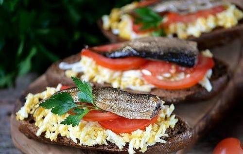 Каждый бутерброд со шпротами, яйцом и помидором украсьте листиком свежей зелени. Гренки со шпротами в качестве закуски подавайте.