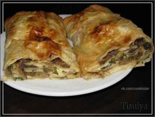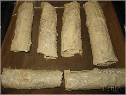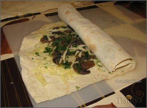 Разложите начинку по лавашу равномерно, не очень густо, немного не доходя до краев, чтоб удобно было скручивать, и сверните рулетом, загнув торцевые края внутрь, чтобы не вытек сыр.