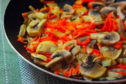 2. тем временем мы приготовим зажарку. Для этого шампиньоны нарезать, мелко нарезать репчатый лук, морковь натереть на крупной терке. Добавить немного растительного масла и обжарить грибы и овощи в течение 3 минут, периодически помешивая их. Добавить зажарку в суп и варить его ещё 7-10 минут.
