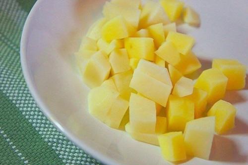 2. картофель нарежьте средним кубиком, залейте водой и поставьте варить. Картофель 5-7 минут после закипания варите.