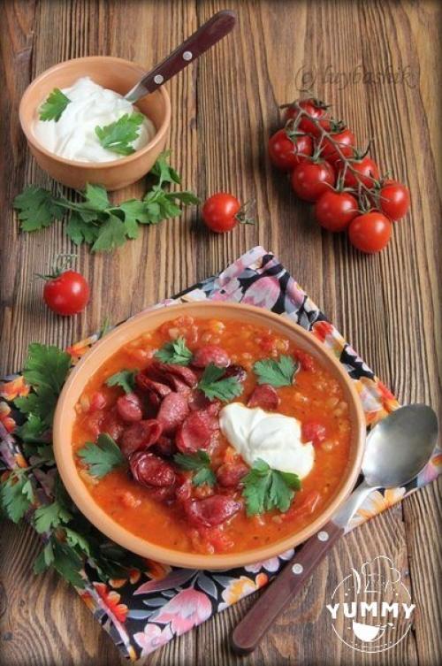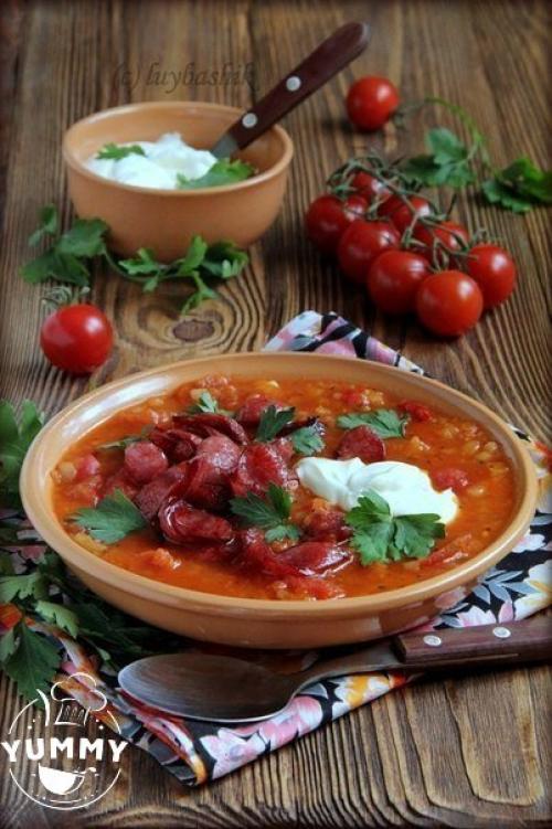 3. выложить в суп консервированные томаты вместе с соком и размять их вилкой.