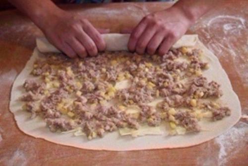 4. тонко раскатать тесто, выложить мясной фарш, на него - овощной.
