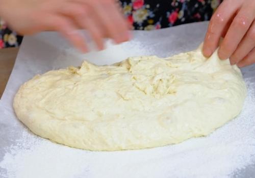 3. пергамент припылить мукой, выложить аккуратно тесто. Тесто будет липнуть, поэтому руки можно припылить мукой или смазать растительным маслом. Сформировать буханку хлеба в соответствии с формой. У меня форма овальная.