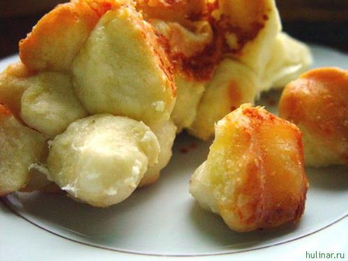 Готовое тесто для хлеба в мультиварке делится на 8 кусочков, из каждого делается лепешка. Внутрь лепешки натирается сыр на мелкой терке и формируется шарик.