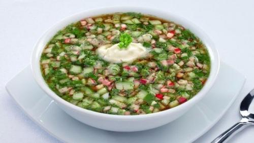 ? 4. Средних картофеля, ? 4 яйца, 5 огурцов, ? 150 г салями, ? 220 г редиса, ? 2 пучка зеленого лука, ? 1 пучок укропа, ? 1 л кефира, ? 900 мл газированной воды, ? Соль, ? Уксус по вкусу, ? Сметана для подачи.