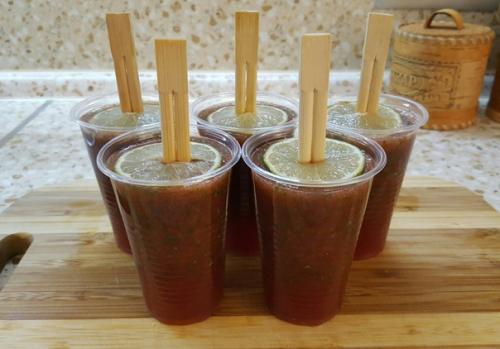 Приготовление: Листья мяты снять со стеблей. Арбуз от семян очистить. Мяту, арбуз и мед перемешать в блендере, залить в одноразовые стаканы. Лайм нарезать кольцами, прорезать середину для палочек. Лаймом с палочками стаканы накрыть. Заморозить. Подписчики@sh_готовят. Cook .