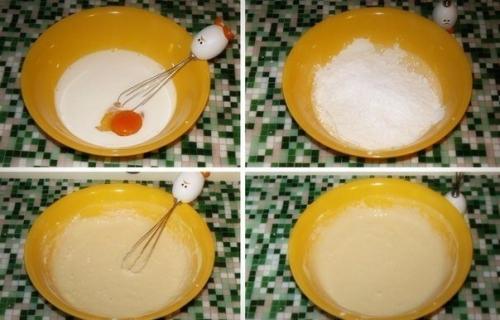 1. для теста мы взбиваем молоко, яйцо и сахар. Просеиваем муку и разрыхлитель. Тщательно перемешиваем до однородности теста.