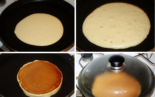 2. разогреваем сухую сковородку с антипригарным покрытием на слабом огне. Потом ставим ее на 2-3 секунды на мокрое полотенце, чтобы немного охладить. Наливаем 1 половник теста. Как , внимание, только по тесту пойдут пузыри, переворачиваем его на другую сторону, накрываем крышкой и готовим еще минуту.