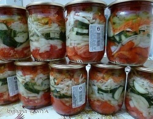 Проверяем дно, оно должно быть горячим. Один совет банки сильно плотно не накладывать чтобы рассол мог свободно проникнуть до самого дна. Салат усадку небольшую даст. После того как закрыли, переварачиваем банку и укутываем. Салат готов. Когда зимой откроите овощи в салате будут хрустящие, но очень вкусные и нежные благодаря растительному маслу. Приятного аппетита.