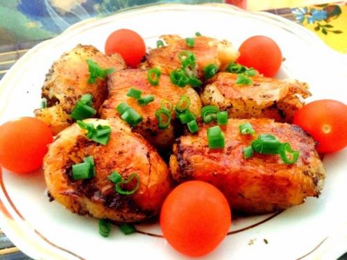 6. через 30 минут достать картофель. Интересный момент: взять толкушку для пюре и слегка надавить на каждую картофелину, чтобы она немного размялась. Затем залить ароматной смесью и снова.