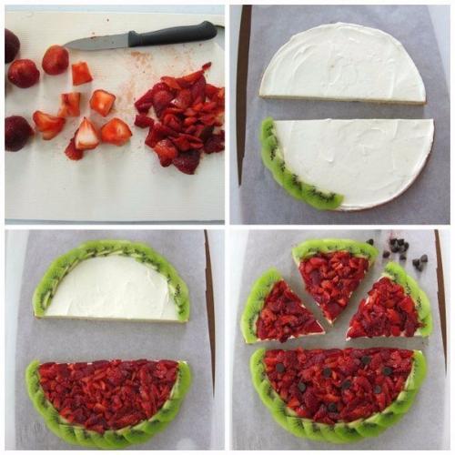 Ингредиенты: бисквит, сливочный сыр, клубника, киви и шоколадные капли