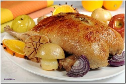 За 1 час до готовности выкладываем на противень картофель, за 30 минут - яблоки, чеснок, лук, дольки апельсина с гвоздикой.
