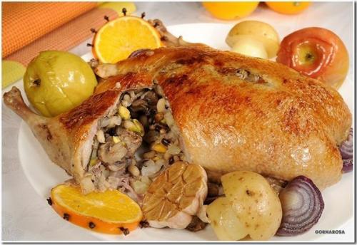 Все компоненты смешиваем, начиняем утку, мы зашиваем.