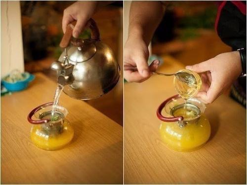 Готовую смесь заливаем подоспевшей горячей водой. Так как мед теряет свои полезные свойства при высоких температурах, выдерживаем минуту, чтобы вода смешалась с холодным соком и чай начал остывать. После этого добавляем мед и оставляем чай завариваться.