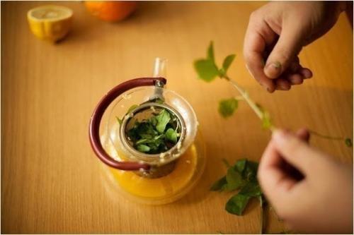 С веточек мяты обрываем листики, рвем их и добавляем в сок.