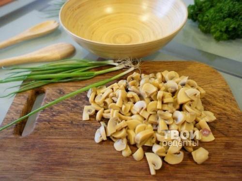 Мы нарезаем грибы маринованные. Затем сцеживаем консервированную кукурузу и высыпаем в салатник. Ветчину нарезаем соломкой. Затем свежие огурцы нарезаем соломкой и добавляем перья зеленого лука. Все перемешиваем солим, заправляем майонезом. Салат готов, приятного аппетита