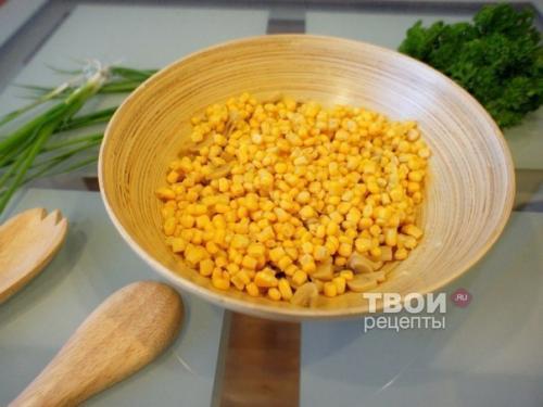 Затем сцеживаем консервированную кукурузу и высыпаем в салатник.