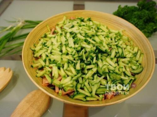 Затем свежие огурцы нарезаем соломкой и добавляем перья зеленого лука.