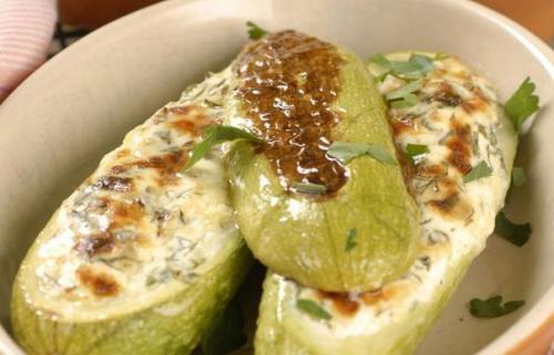 Сперва кабачки следует вымыть, срезать с каждого боковину толщиной 1, 5 см и аккуратно чайной ложкой удалить сердцевину из основной части. Далее творог через сито протереть. Сыр натереть на мелкой терке. Чеснок очистить и измельчить. Зелень вымыть, обсушить и мелко нарезать.