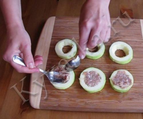 5. серединки кружков кабачка заполните фаршем. Уплотните.