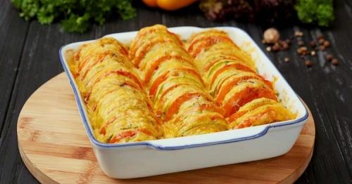 Выложи овощи в форму для запекания, разместив их вертикально и чередуя друг с другом.
