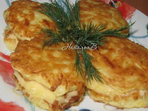 . кабачковой массы - обжарить одну сторону до румяного цвета, перевернуть блинчики, убавить огонь и под крышкой жарить до готовности (минут 5-7. А пока, сыр и очищенный чеснок натереть на мелкой терке и перемешать, чуть посолить. Горячий блинчик выложить на блюдо, сверху положить большую пясточку сырно - чесночной массы и накрыть вторым горячим блинчиком, сильно не прижимать - так сделать все блинчики. Дать им немного остыть и подавать. Приятного аппетита!