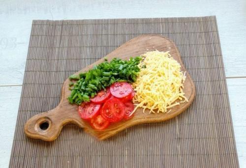 Кабачки натрите на тёрке и отожмите лишний сок. Добавьте 5 яиц, немного соли, молотого чёрного перца и хорошо перемешайте. Добавьте муку. Тщательно смешайте компоненты теста. Тесто должно получиться густым, как для приготовления оладий. Разогрейте сковороду. Смажьте маслом и, выложив порцию теста, разровняйте его ложкой по дну сковороды, придавая форму блина. Эти пышные блины и станут коржами нашего торта из кабачков. Обжаривайте коржи несколько минут с двух сторон, до золотистого цвета. Пока обжариваются коржи, можно подготовить "Крем" для нашего торта. Для этого смешайте йогурт, несколько измельчённых зубчиков чеснока. Добавьте соль, молотый чёрный перец по вкусу. Можно дополнительно добавлять свежую зелень. Подготовьте начинку для торта. У нас помидоры и зелёный лук, натёртый сыр. Когда коржи будут готовы, их необходимо охладить, прежде чем приступать к сборке торта. На сковороде диаметром 22 сантиметра у нас получается 7-8 коржей. Охлаждённый кабачковый корж смажьте подготовленным кремом. Выложите слой начинки. Слои. Нарежьте нарежьте торт на порционные кусочки и подавайте. приятного аппетита!