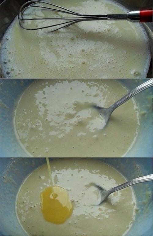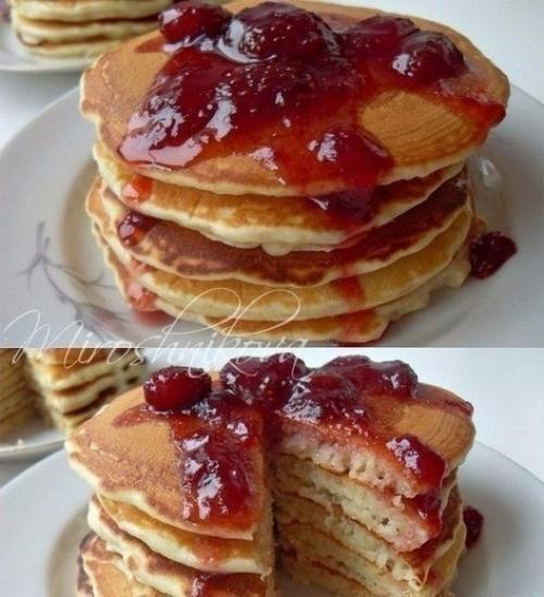 Масло растопить и влить в тесто, перемешать. (Забыла сфотографировать готовое тесто. Выливать небольшие порции теста. Примерно по 2 ст. Ложки на сковороду, не смазанную маслом. Печь с одной стороны до образования пузырьков. Перевернуть, печь еще чуть меньше минуты. Выложить панкейки на тарелку, по желанию сверху полить вареньем/сгущенкой/топпингом и тд. Кушать или по одному, или как на фото, разрезая (так вкуснее. Автор: Софья Мирошникова.