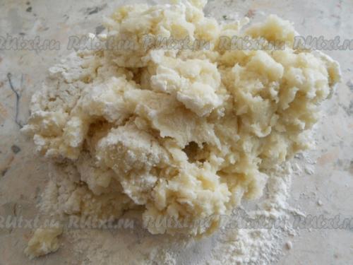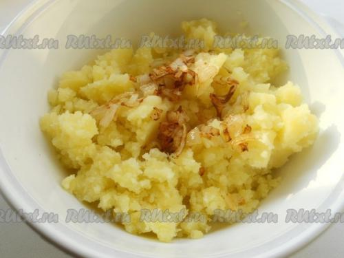 В это время начинку подготовить. Приготовить картофельное пюре (отварить картофель в подсоленной воде и размять. Лук очистить и порезать мелко, обжарить на растительном масле до золотистого цвета. Добавить в картофель и хорошо перемешать.
