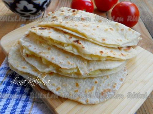 Каждый шарик раскатать в тонкую лепешку, наколоть вилкой и обжарить на сухой сковороде с двух сторон до появления небольших темных пятнышек. Жарятся лепешки быстро, огонь - средний.
