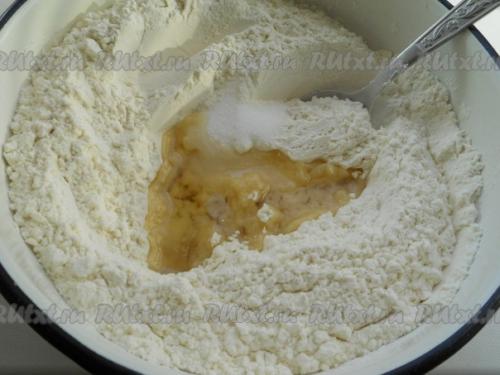 Муку просеять в глубокую миску. Соль и растительное масло добавить.