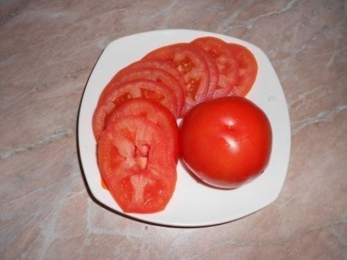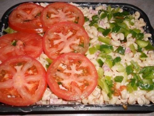 Сверху на макароны выкладываем помидоры и болгарский перец.