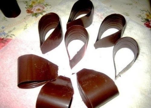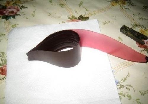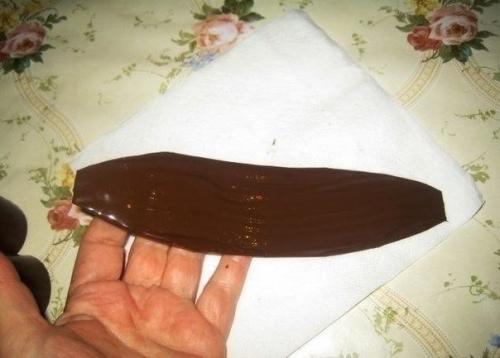2 из плотного файла вырезаем полоску, длиной 20 см и шириной 5 см (уголки обрезаем, так потом удобнее будет укладывать бант. С помощью силиконовой кисточки намазываем шоколад на полоску, слой не должен быть очень тонким, чтобы потом не ломался. И чтобы не было просветов на шоколаде.